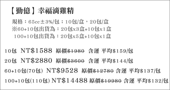 | 勤億-幸福滴雞精-獨家優惠!頂級滴雞精品牌,嚴選阿里山下幸福老母雞,慢火精煉六小時,遵循古法、步步講究,過程不加一滴水平均每包最低只要132元起(含運)即可享有【勤億】幸福滴雞精10包/20包/60+ 售價:132 我要購買 |