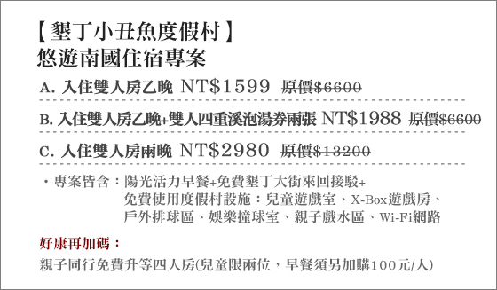 $1599-雙人住宿乙晚專案 $1988-雙人住宿乙晚+四重溪泡湯券專案 $2980-雙人住宿兩晚專案 享受悠閒愜意的南國慢活 可於假日加價 ...